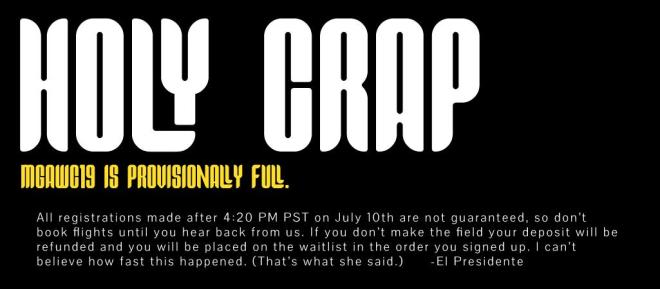 July 11 9:41AM PST Update: I’m working on a solution to make sure everyone who wants to go to MGAWC19 can get in. If you want to go and haven’t put down a deposit yet, do that ASAP at MGAWC.com to hold your spot in line. If everything falls apart and we can’t get you in, your deposit will be refunded. Here’s a video of me talking about all this. -El PresidenteView this post on Instagram