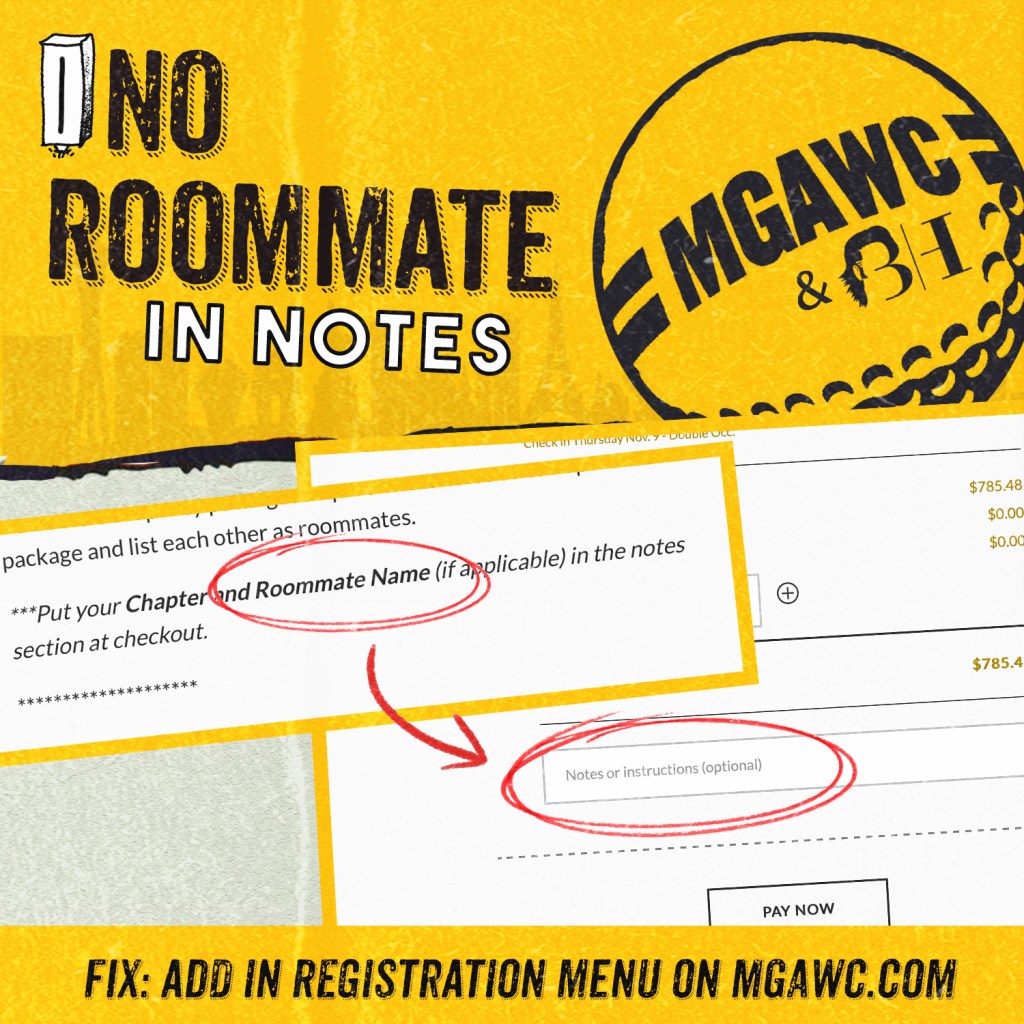 We asked very nicely for you to put your roommate’s name in the notes box at checkout (if you booked at double occupancy package). Many of you very nicely chose to ignore that request. Feel free to give us your roommate’s name HERE at your convenience.