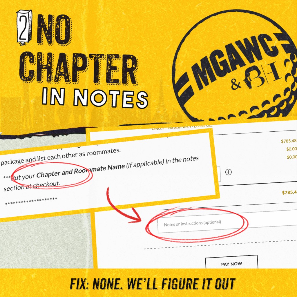 A little less nicely and with a hint of frustration, we asked you to give us your Chapter in the notes box at checkout. You did not. No need to email it to us now, as we will process all the slackers in one big, illiterate pile.