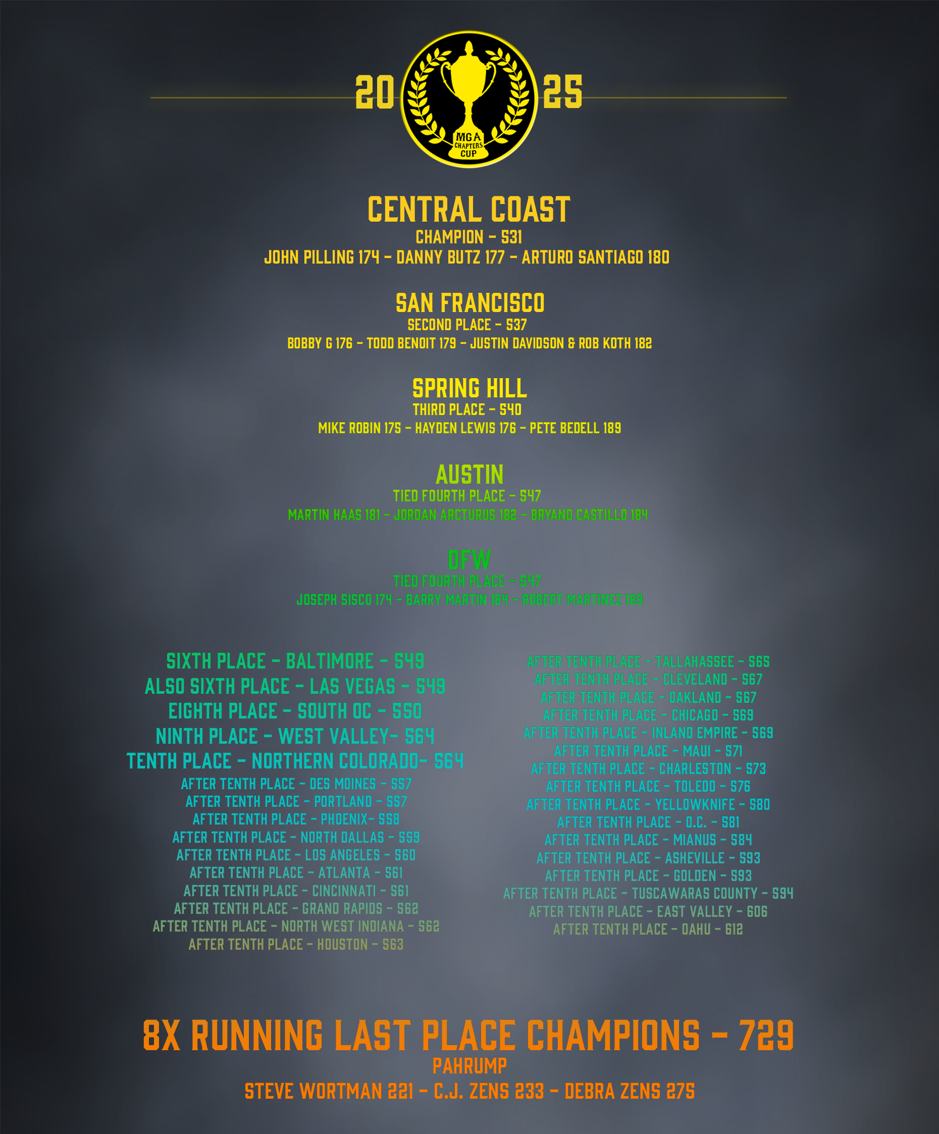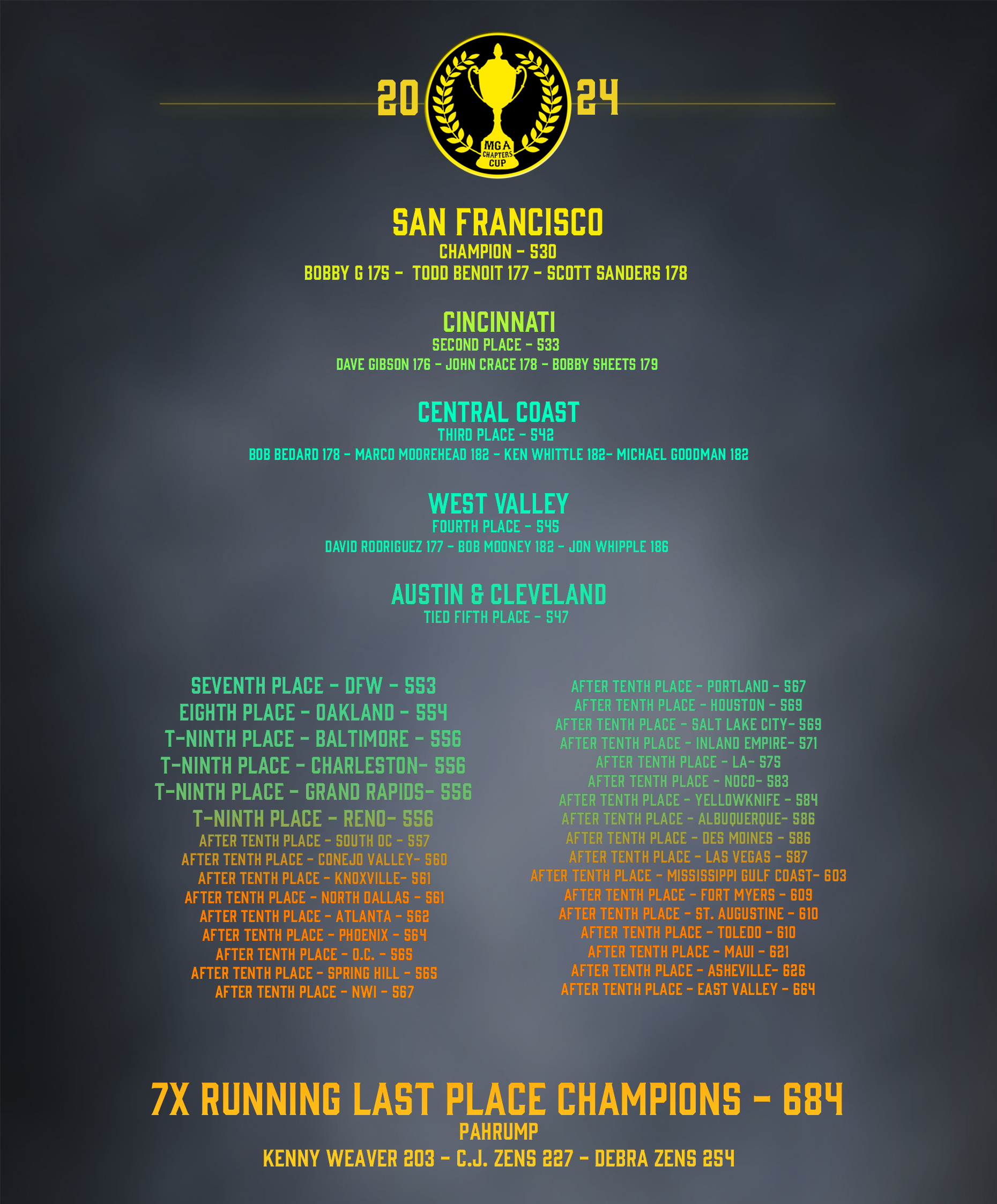 The Chapters Cup is awarded each year at the MGA World Championship to the chapter with the lowest total team score. Only the top three scores from each chapter are totaled, so any chapter with at least three players is eligible to win the Cup. Chapters with more than three players greatly improve their odds of winning.